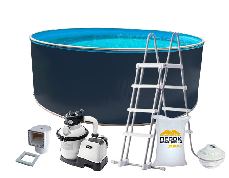Расширенный комплект с дополнительным оборудованием : стандартная заводская комплектация плюс песчаный фильтр, лесница, песок кварцевый для фильтра и тепловой насос для комфортного купания.