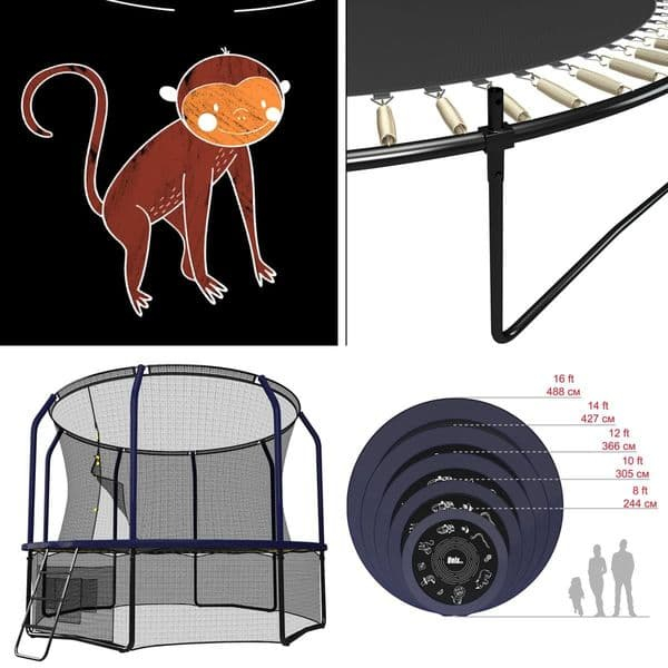 Помимо верхней защитной сетки, все батуты премиального модельного ряда UNIX line оборудованы нижней защитной сеткой, которая препятствует проникновению под прыжковое полотно батута детей, животных, а также попаданию посторонних предметов, и лестницей для удобства пользования. Так же в комплект входят специальные крепления батута к земле (колышки).